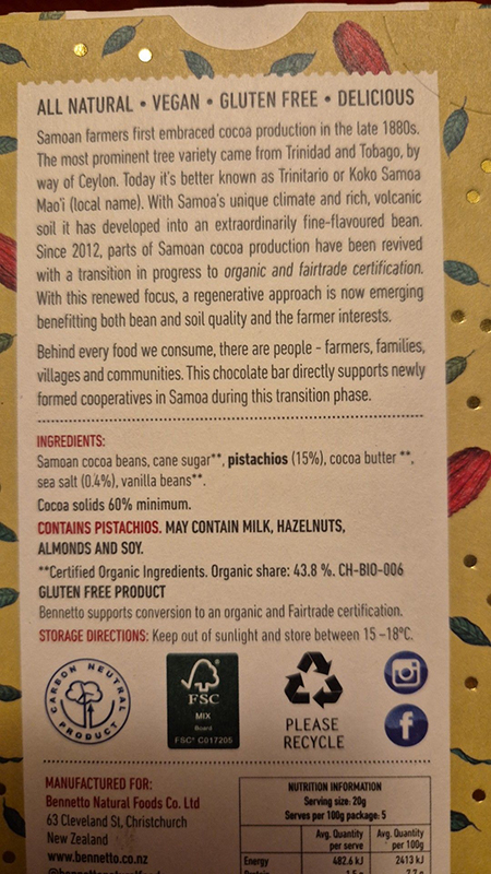 Samoa Cocoa Beans, Cane Sugar*, Pistachios (15%), Cocoa Butter, Sea Salt (0,4%), Vanilla Beans**.