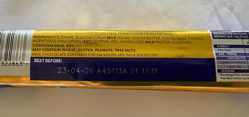 Sugar, Glucose Syrup, Milk Solids, Cocoa Butter, Cocoa Mass, Raising Agent (500), Emulsifiers (Soy Lecithin, 476), Hydrolysed Milk Protein, Flavours.