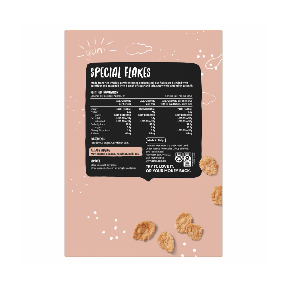 Coles I’m Free From Special Flakes 375g Coles I'm Free From Special Flakes 375g Product Details Additional Information INGREDIENTS (JANUARY 2026): Rice (89%), Sugar, Cornflour, Salt. AVAILABLE AT: Coles AFK RANKING: Better Kellogg’s Crispix Honey Pillows Breakfast Cereal 460gLean Cuisine Thai Red Chicken Curry With Rice 375g