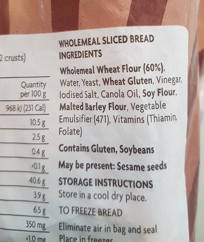Wholemeal wheat flour (60%), water, yeast, wheat gluten, vinegar, iodised salt, canola oil, soy flour, malted barley flour, vegetable emulsifier (471),?vitamins (thiamin, folate)