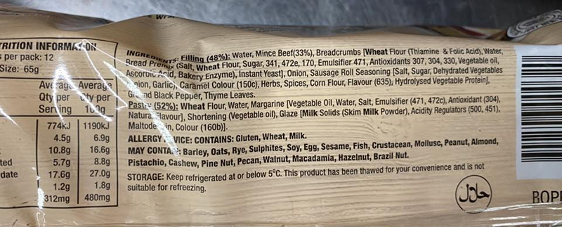 Filling (48%): Water, Mince Beef (33%), Breadcrumbs [Wheat Flour (Thiamine & Folic Acid), Water, Bread Premix (Salt, Wheat Flour, Sugar, 341, 472e, 170, Emulsifier 471, Antioxidants 307, 304, 330, Vegetable Oil, Ascorbic Acid, Bakery Enzyme), Instant Yeast], Onion, Sausage Roll Seasoning [Salt, Sugar, Dehydrated Vegetables, Onion, Garlic), Caramel Colour (150c), Herbs, Spices, Corn Flour, Flavour (635), Hydrolysed Vegetable Protein]. Ground Black Pepper, Thyme Leaves.