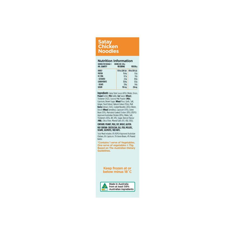 Satay Style Sauce (43%) (Water, Onion, Peanut Butter, Milk Solids, Soy Sauce (Wheat), Thickener (1422), Coconut Milk Powder (Milk), Capsicum, Brown Sugar, Wheat Flour, Garlic, Salt, Ginger, Yeast Extract, Natural Colour (150a), Malt Barley Extract, Chilli), Cooked Noodles (26%) (Water, Durum Wheat Semolina), Capsicum (10%), Green Bean (10%), Marinated Cooked Chicken (10%) (RSPCA Approved Australian Chicken (83%), Water, Salt, Thickeners (407a, 407,415), Sugar, Natural Flavour (Milk), Citrus Fibre, Mineral Salts (451,450,508)).
