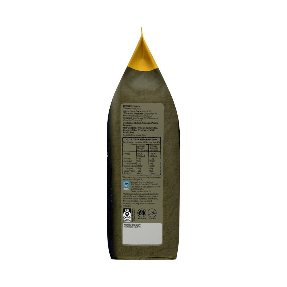 Whole Grain Oats, Nuts 10% (Almonds, Pecans), Golden Syrup, Seeds 8% (Sunflower, Pepitas, Sesame), Sunflower Oil, Cinnamon, Vitamin (Vitamin E).