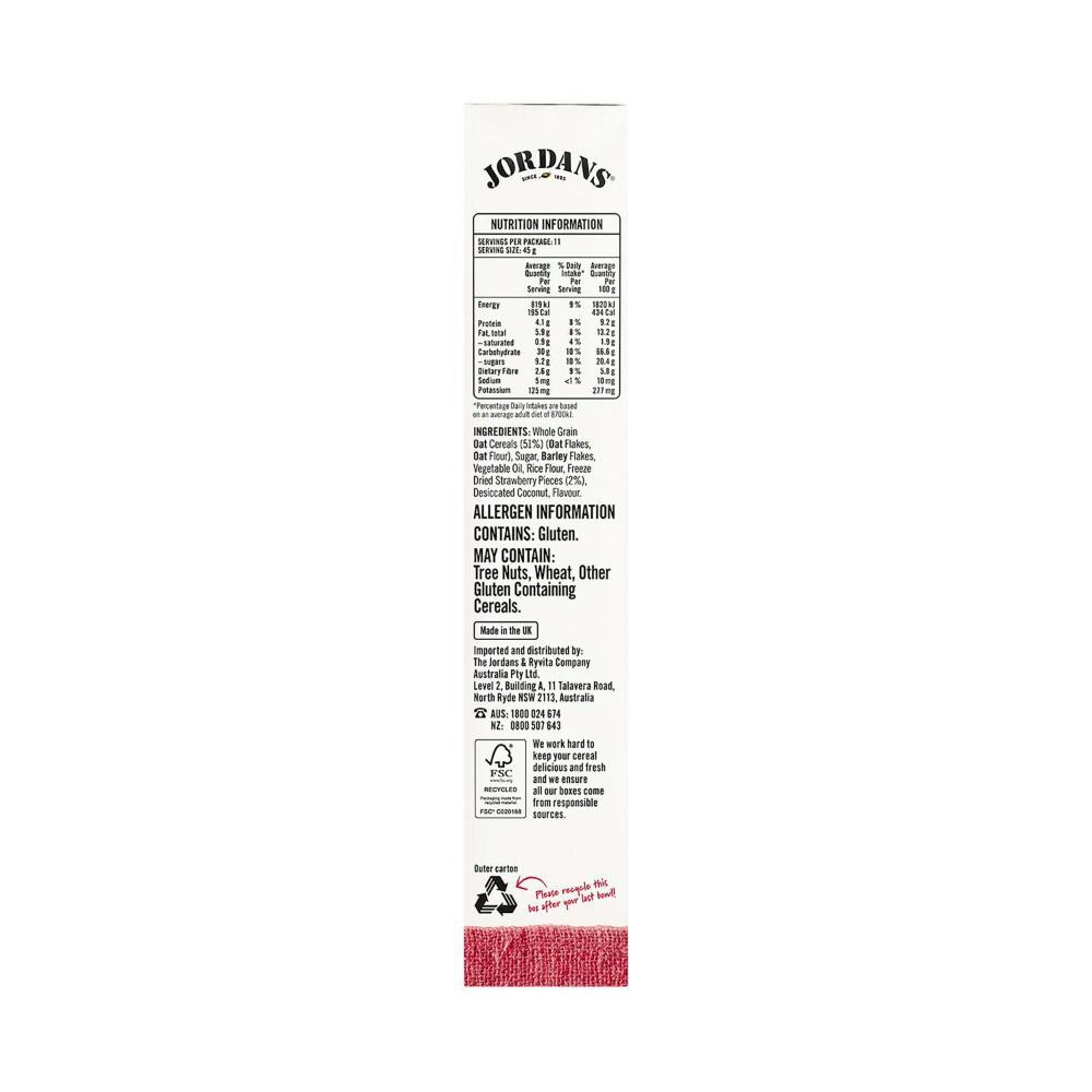 Whole Grain Oat Cereals (51%) (Oat Flakes, Oat Flour), Sugar, Barley Flakes, Vegetable Oil, Rice Flour, Freeze Dried Strawberry Pieces (2%), Desiccated Coconut, Flavour.