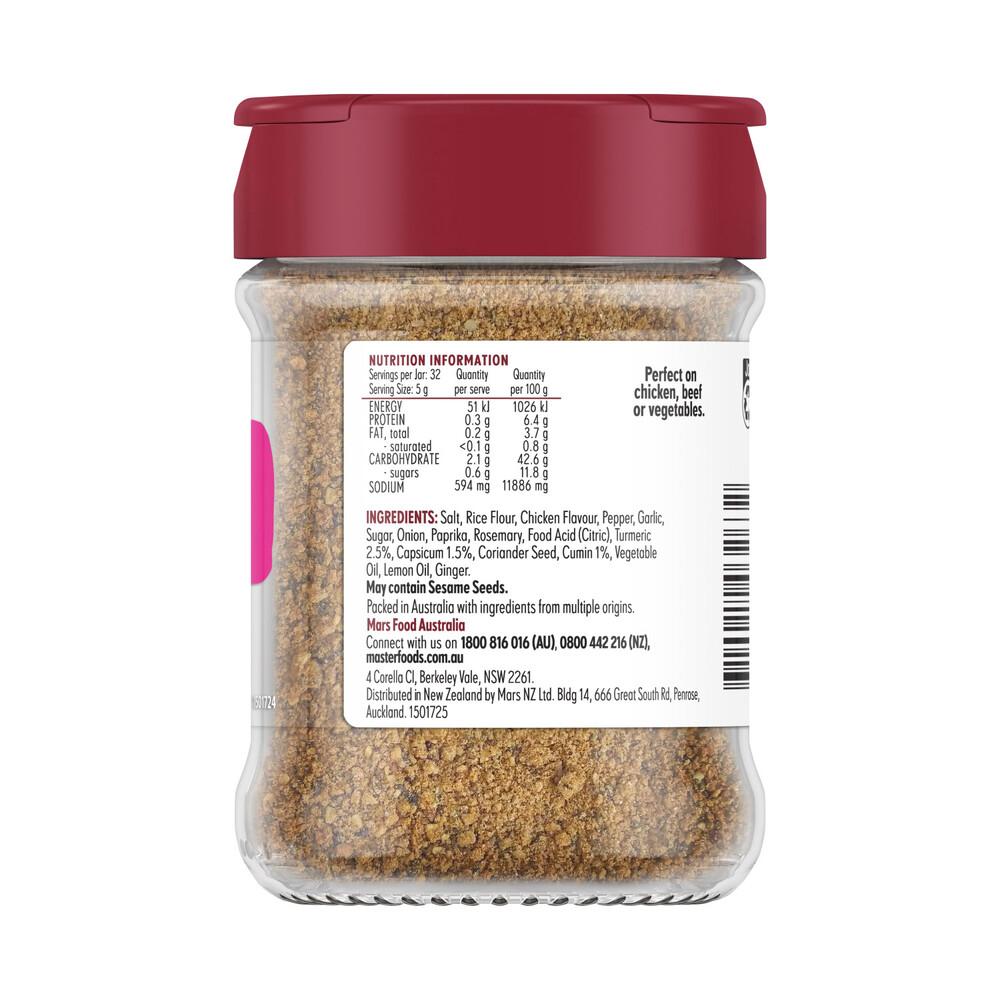 Salt, Rice Flour, Chicken Flavour, Pepper, Garlic, Sugar, Onion, Paprika, Rosemary, Food Acid (Citric), Turmeric 2.5%, Capsicum 1.5%, Coriander Seed, Cumin 1%, Vegetable Oil, Lemon Oil, Ginger.