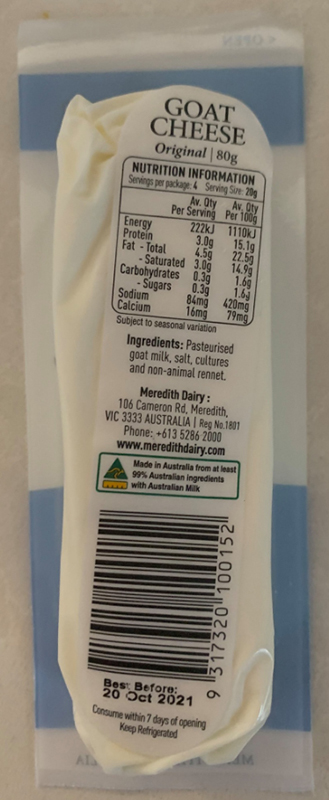 Meredith Dairy Goat’s Cheese Chevre Plain 80g Meredith Dairy Goat's Cheese Chevre Plain 80g Product Details Additional Information INGREDIENTS (AS AT 14TH JULY 2021):Pasteurised Goat Milk, Salt, Cultures and Non-Animal Rennet. AVAILABLE AT:ColesIGAWoolworths AFK RANKING:Better Mainland Vintage Block 400gMungalli Creek Fetta in Brine 250g