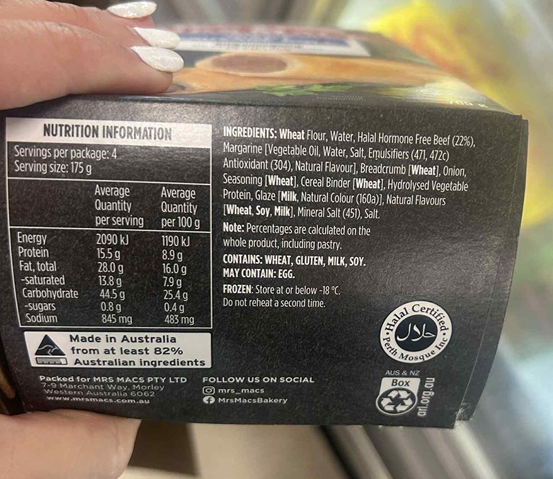 Wheat Flour, Water, Halal Hormone Free Beef (22%), Margarine [Vegetable Oil, Water, Salt, Emulsifiers (471, 472c), Antioxidant (304), Natural Flavour], Breadcrumb [Wheat], Onion, Seasoning [Wheat], Cereal Binder [Wheat], Hydrolysed Vegetable Protein, Glaze [Milk, Natural Colour (160a)], Natural Flavours [Wheat, Soy, Milk], Mineral Salt (451), Salt.