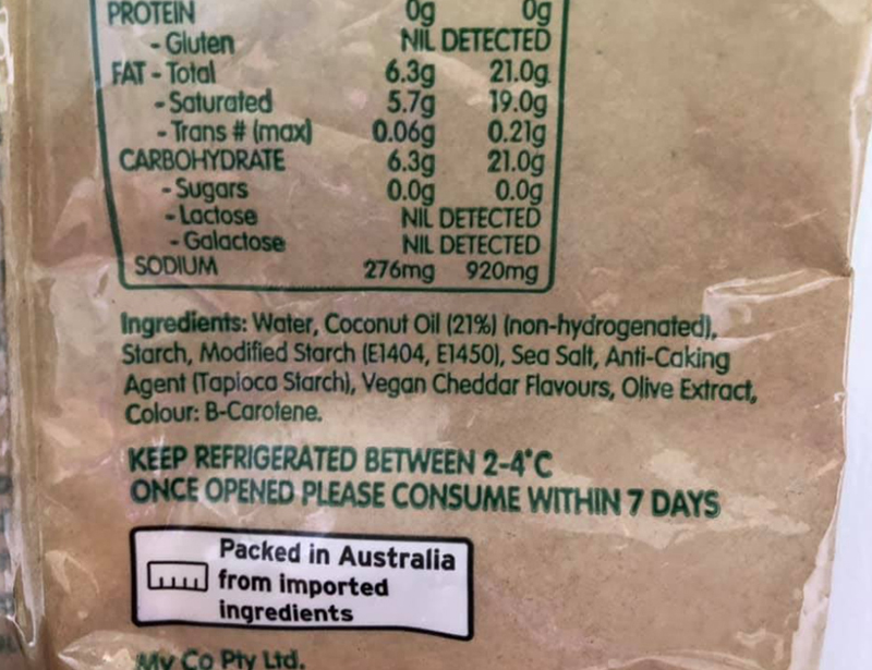 Water, Coconut Oil (24%) (Non-Hydrogenated), Starch, Modified Starch (E1404, E1450), Sea Salt, Anti-Caking Agent (Tapioca Starch), Vegan Cheddar Flavours, Olive Extract, Colour: B-Carotene.