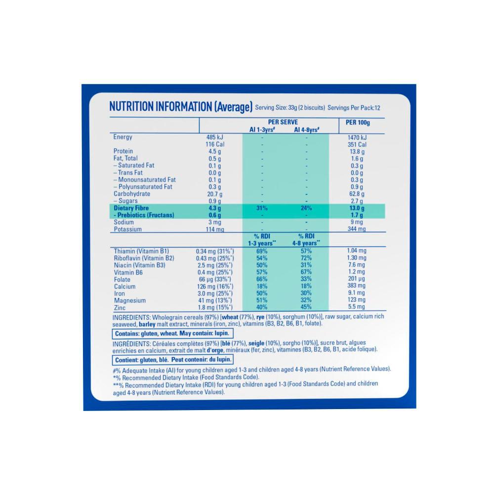 Wholegrain Cereals (97%) [Wheat (77%), Rye (10%), Sorghum (10%)], Raw Sugar, Calcium Rich Seaweed, Barley Malt Extract, Minerals (Iron, Zinc), Vitamins (B3, B2, B6, B1, Folate).