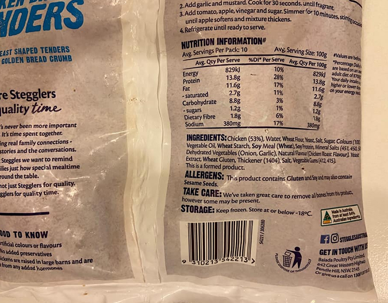Chicken (53%), Water, Wheat Flour, Yeast, Salt, Sugar, Colours (100, 160b), Vegetable Oil, Wheat Starch, Soy Meal (Wheat), Soy Protein, Mineral Salts (451, 450, 500), Dehydrated Vegetables (Onion, Garlic), Natural Flavour (Chicken Roast Flavour), Yeast Extract, Wheat Gluten, Thickener (1404), Salt, Vegetable Gums (412, 415).