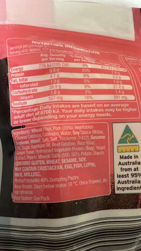 Wheat Flour, Pork (28%), Vegetables (Chinese Cabbage, Cabbage), Water, Soy Sauce (Water, Soybean, Wheat, Salt), Salt, Thickener (1422), Sesame Oil, Sugar, Vegetable Oil, Beef Gelatine, Rice Wine, Ginger Puree, Hydrolysed Vegetable Protein (Soy), Yeast Extract, Pepper, Mineral Salts (500, 501), Potato Starch.