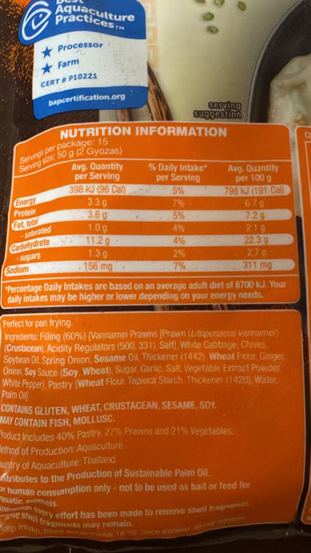 Filling (60%) [Vannamei Prawns (Prawn (Litopenaeus Vannamel) (Crustacean), Acidity Regulators (500, 331), Salt), White Cabbage, Chives, Soybean Oil, Spring Onion, Sesame Oil, Thickener (1442), Wheat Flour, Ginger, Onion, Soy Sauce (Soy, Wheat), Sugar, Garlic, Salt, Vegetable Extract Powder, White Pepper], Pastry [Wheat Flour Tapioca Starch, Thickener (1420), Water, Palm Oil].