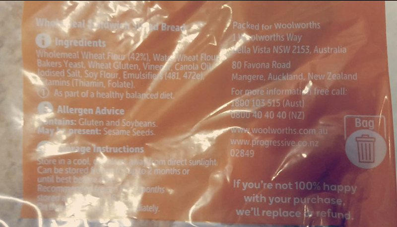 Wholemeal wheat flour (42%),?water,?wheat flour, bakers?yeast, wheat gluten, vinegar, canola oil, iodised salt, soy flour, emulsifiers (481, 472e), Vitamins (thiamin, folate)